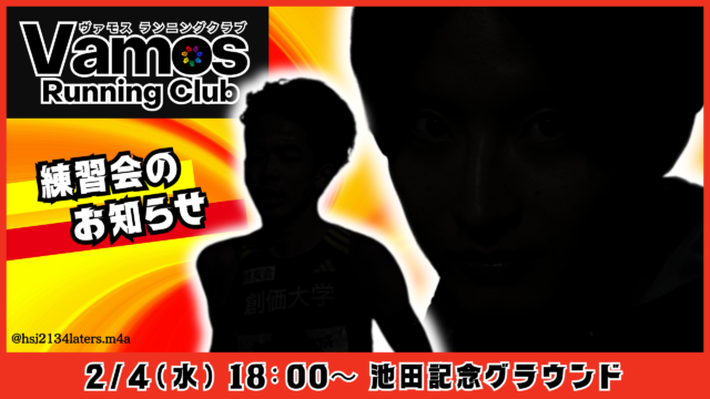 練習会のお知らせ 2026年2月4日(水) 2026年2月3日 vomos https://vamos-rc.com/wp-content/uploads/2024/03/uplogo.png ヴァモス ランニングクラブ
